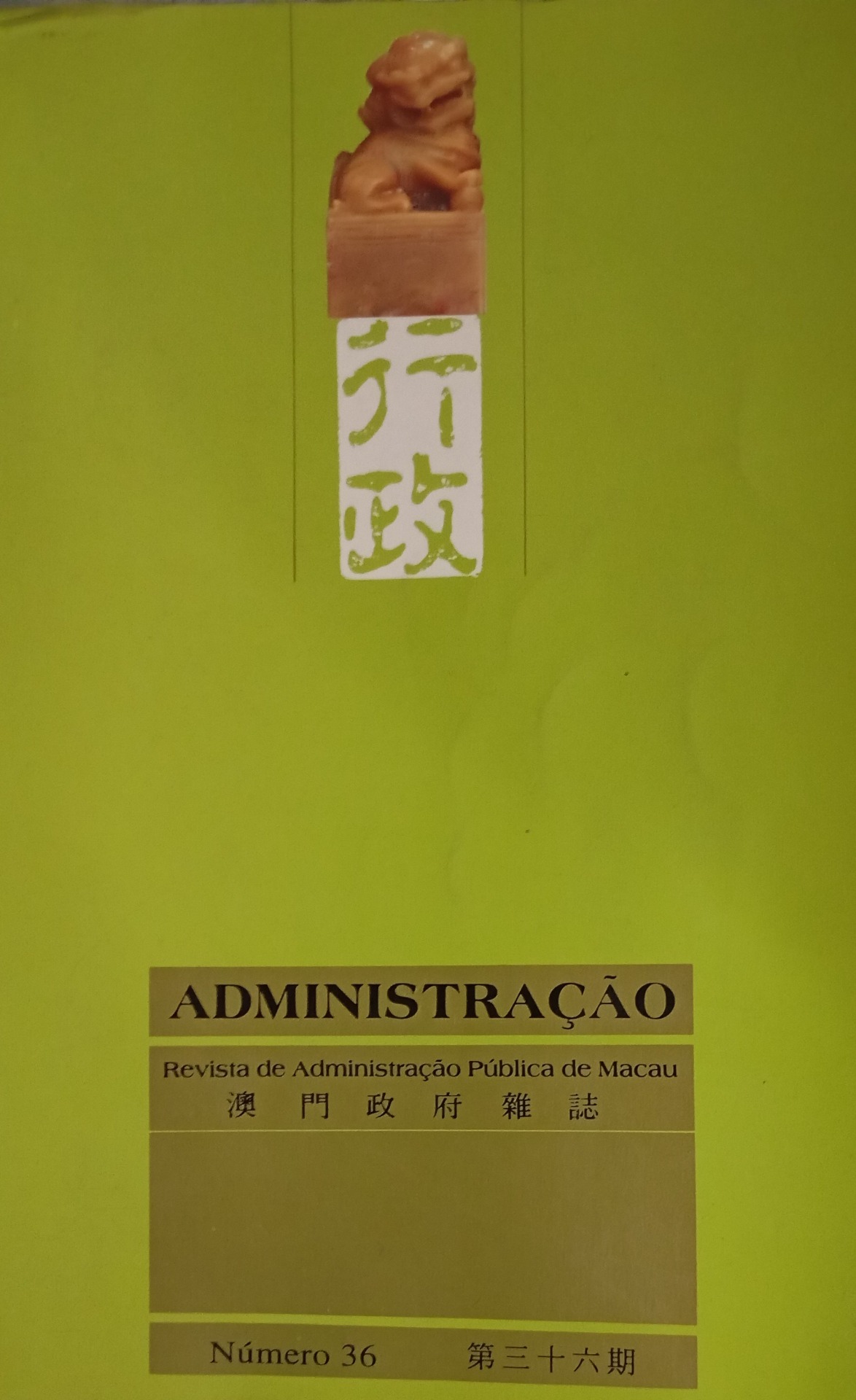 "Administração - Revista de Administração Pública de Macau; N° 36; Macau, 1997". É o livro bilíngue português/ mandarim escolhido pelo o Gia. Um N° em interesse máximo, 773 páginas, a principiar em "A arte de escrever e magia" e a terminar em "A ideologia do serviço Social com Jovens". São Portugal, e, a cultura identitária, à China, parceira em Macau, devedora da administração bi-partida até início do Séc. XXI (calendário gregoriano; 21, vinte-um) 20 de Dezembro de 1999. O livro espreme politicamente, língua, economia, sociedade todo o período histórico até então e tenta a posteriori. Diferencia em olhar de distância presente-passado-futuro o vislumbre Hong Kong (diplomacia Britânico-Chinesa). Macau, influência portuguesa: sistema jurídico próprio, estruturalizante!, das estruturas. Um país, Macau, dois sistemas, cedido em poder em decadência do poder caído e em queda do colonialismo português, prometido em esforço ao cenário multifacetado de cultura chinesa desde a dinastia Ming. Cenários e prospectivas fixas desde então até depois de 2049: